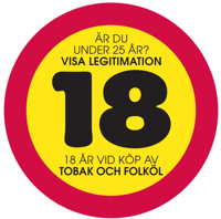 Publicerad:Beställ dekalen: "Är du under 25 år? Visa legitimation. 18 år vid köp av tobak och folköl".