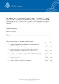 Publicerad:Blankett på nordsamiska som kan användas av regionerna i samband med vaccination. Den kan fyllas i digitalt och skrivas ut på papper.