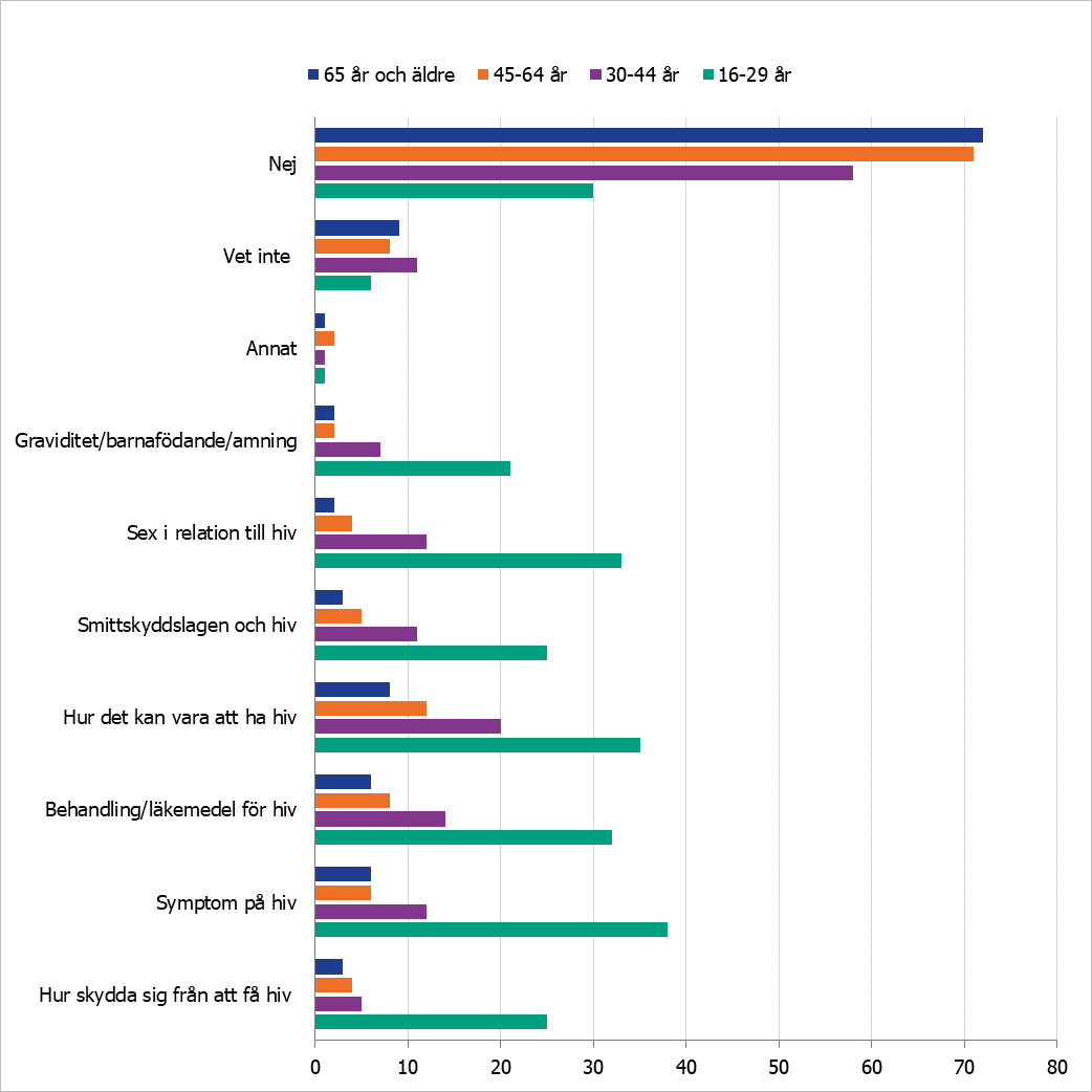 Få hade sökt information om hiv, eller kontaktat vården eller exempelvis en ideell organisation för personlig rådgivning om hiv. Det var också få totalt sett som uttryckte att de behövde kunskap om hiv, men de yngsta (16–29 år) uttryckte det i störst utsträckning.