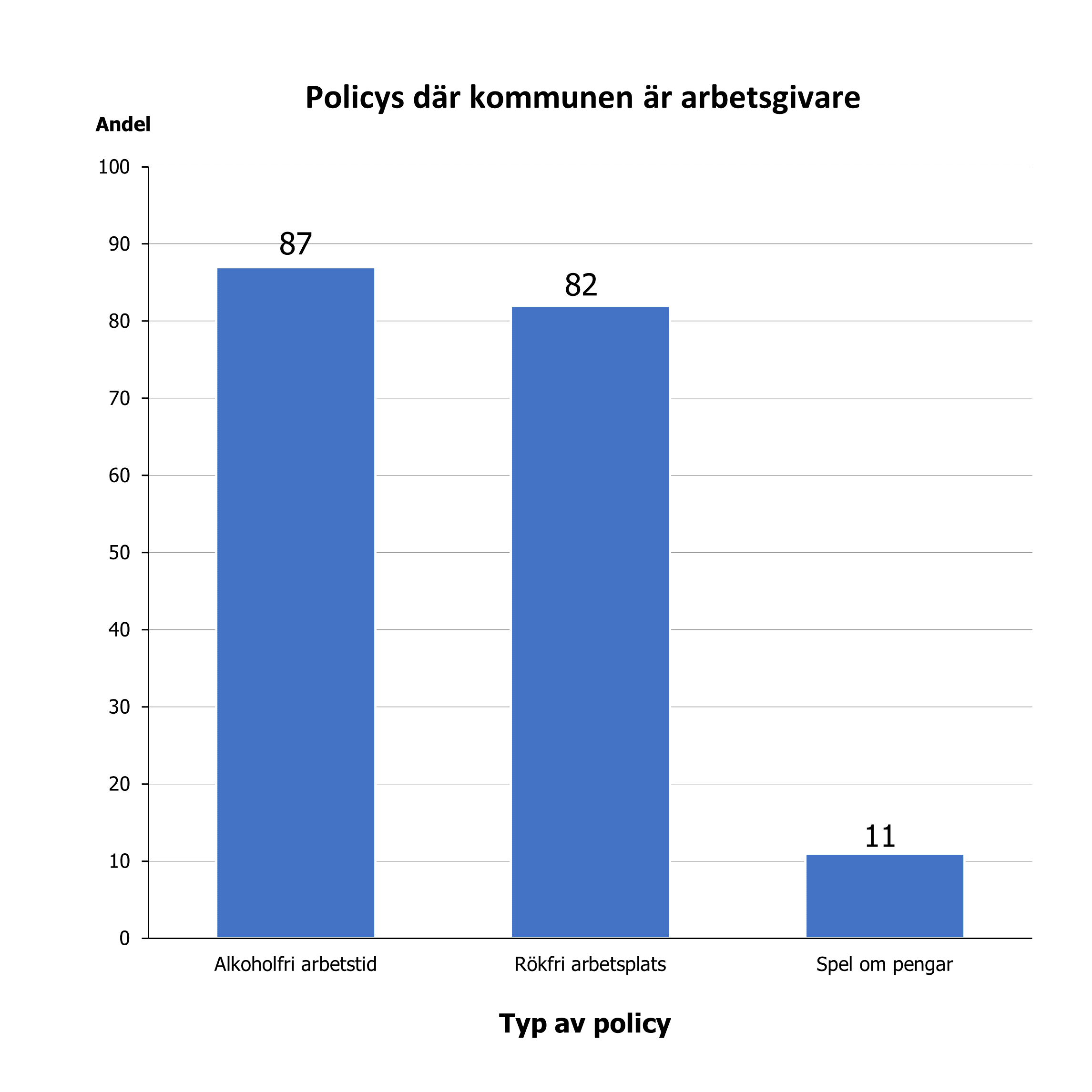 Majoriteten av kommunerna har utifrån sin roll som arbetsgivare policyer kring alkohol, droger och tobak, medan endast runt 11 procent av samtliga kommuner har en policy som berör spel om pengar (Figur 1).